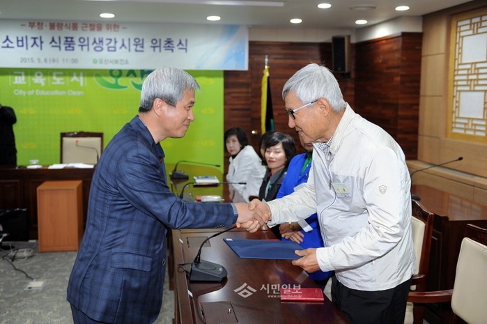 경기 오산시가 지난 6일 시청 상황실에서 '2015년 소비자식품위생감시원 위촉식'을 열어 곽상욱 오산시장(왼쪽)이 식품위생감시원에게 위촉장을 수여하고 악수하고 있다. (사진제공=오산시청)