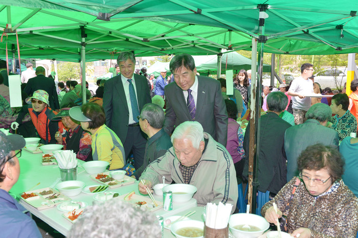 경기 동두천시 불현동 주민센터가 지난 7일 오전 11시30분 주민센터 주차장에서 '제43회 어버이날 기념 경로잔치'를 개최해 오세창 시장(가운데)과 관계자들이 참석해 식사 중인 노인들에게 인사를 전하고 있다. (사진제공=동두천시청)