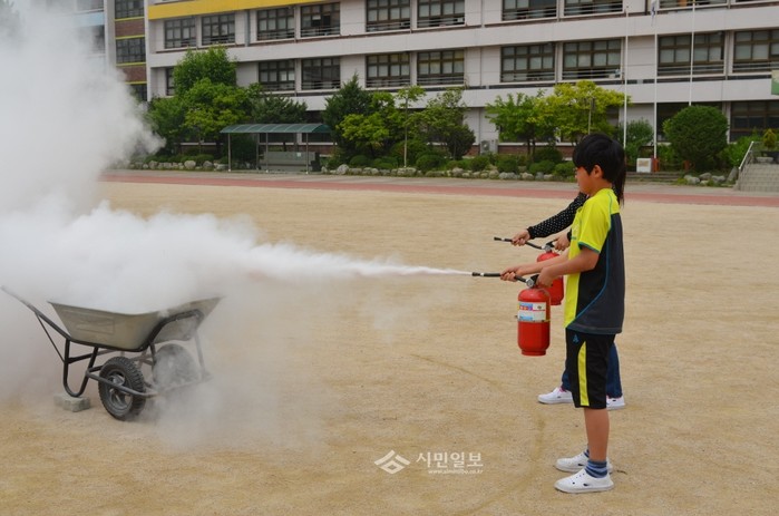 서울 강남소방서가 지난 8일 개포동에 위치한 개원초등학교에서 학생과 교사 150여명을 대상으로 화재대피 훈련을 실시해 참여 어린이들이 소화기를 이용해 불을 끄는 훈련을 하고 있다. (사진제공=강남소방서)
