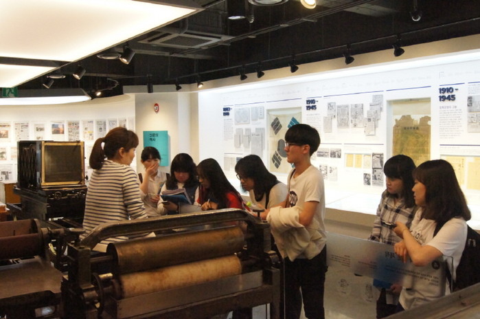경북 구미시 금오고등학교 신문 동아리 '온새미로' 학생들이 최근 동아미디어그룹 광화문 사옥을 방문해 미디어 분야 현장체험 견학 활동의 일환으로 역사전시물을 관람하고 있다. (사진제공=구미교육지원청)