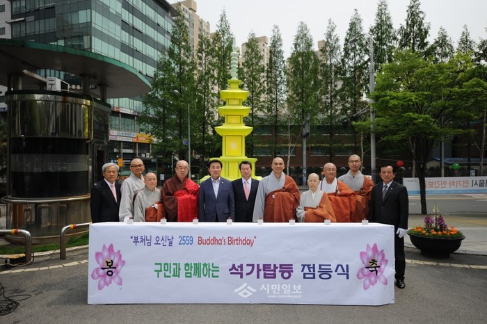 서울 중랑구가 불기 2559년 부처님 오신 날을 맞아 최근 구청에서 '구민과 함께하는 석가탑등 점등식'을 개최해 나진구 구청장(가운데)과 스님들이 부처님 오신 날을 축하하고 평화를 기원하는 석가탑등 점등식을 봉행한 후 기념촬영하고 있다.(사진제공=중랑구청)