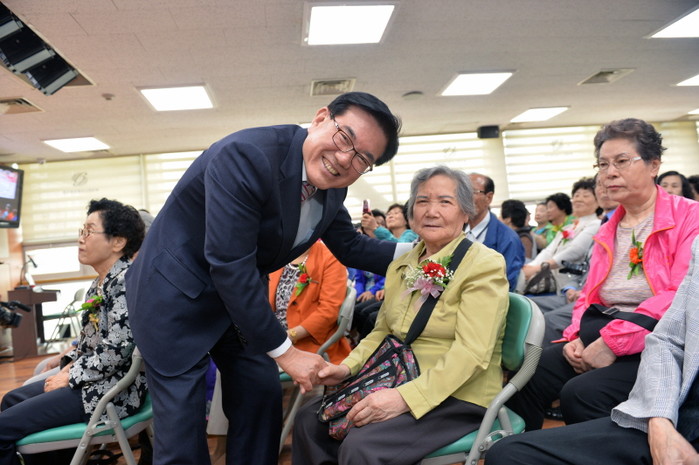 유덕열 동대문구청장이 지난 7일 오전 10시30분 동대문노인종합복지관에서 열린 '제43회 어버이날 및 동대문노인종합복지관 개관 12주년 기념행사'에 참석해 카네이션을 가슴에 단 노인과 악수하며 기념촬영을 하고 있다.(사진제공=동대문구청)