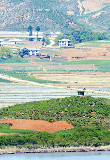 북한이 지난 8일 '모의 탄도탄(더미탄)' 사출 시험에 성공, 잠수함발사 탄도미사일(SLBM) 개발 막바지 단계인 사출시험에 사실상 성공하며 SLBM의 전력화 과정을 밟고 있는 가운데 10일 경기 파주시 오두산 통일전망대에서 바라본 북한 황해북도 개풍군 들녘에서 북한군 초소 인근으로 북한 주민들이 걸어다니고 있다.