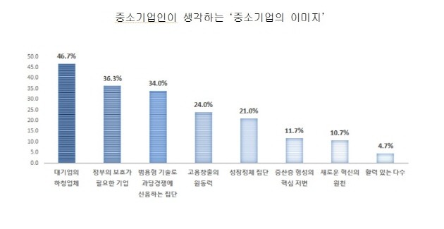 중소기업중앙회가 300개 중소기업을 대상으로 조사해 10일 발표한 '중소기업정책 인식조사 보고서'에 따르면 46.7%가 중소기업의 이미지는 '대기업의 하청업체'라고 답했다.