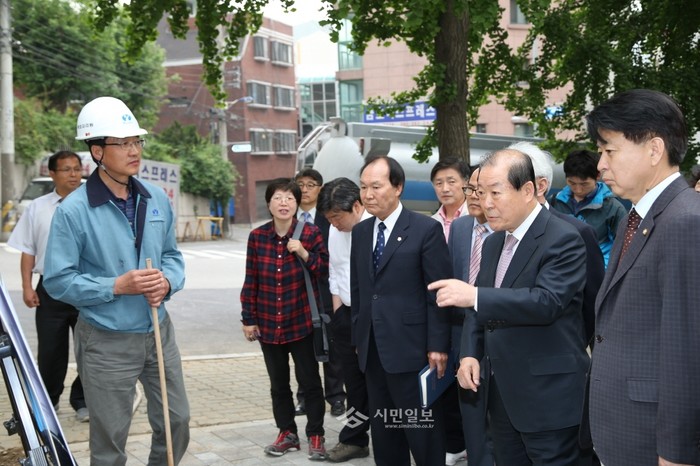 박홍섭 마포구청장(오른쪽에서 두 번째)이 최근 오후 노웅래 국회의원등과 함께 경의선 숲길공원 2단계 공사 현장인 새창고개 주변을 방문해 관계자의 설명을 듣고 있다. (사진제공=마포구청)