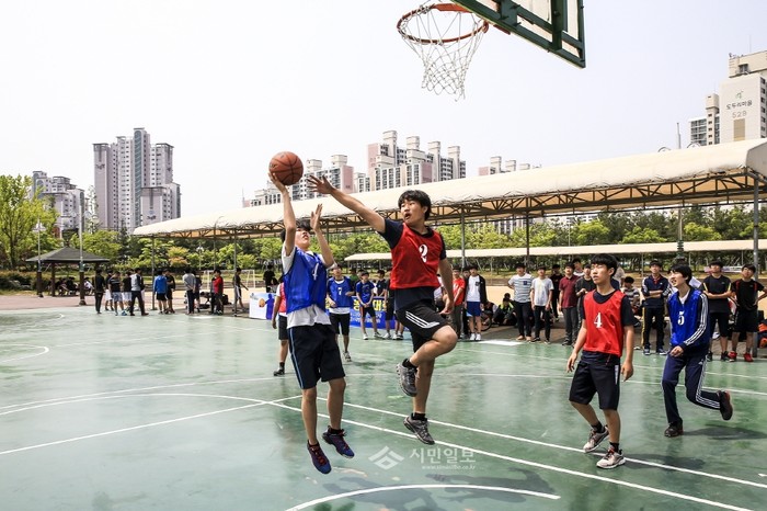 인천 계양구가 최근 청소년의 달 행사를 개최한 가운데 행사의 일환으로 '제14회 청소년 길거리 농구대회'가 열려 참여 청소년들이 경기를 펼치고 있다. (사진제공=계양구청)