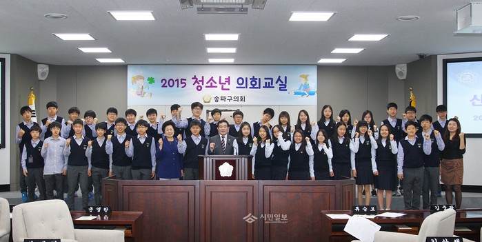 서울 송파구의회가 최근 신천중학교 학생 37명을 대상으로 청소년의회교실을 열었다. 이날 학생들은 의회시설을 둘러보고, 5분 자유발언과 안건 처리 등의 의사결정을 하는 모의의회 체험을 실시했다. 사진은 임춘대 의장(앞줄 가운데)와 의회교실에 참가한 학생들이 기념촬영을 하는 모습.(사진제공=송파구의회)