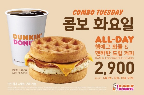 던킨도너츠 관계자는 "던킨도너츠가 5월에도 매주 화요일, 수요일 두 가지 제품을 할인된 가격에 만나볼 수 있는 ‘콤보화요일’, ‘해피수요일’ 프로모션을 준비했다"며 "앞으로도 꾸준히 다양한 고객 혜택 프로모션을 선보여 고객 사랑에 보답하겠다"고 전했다.