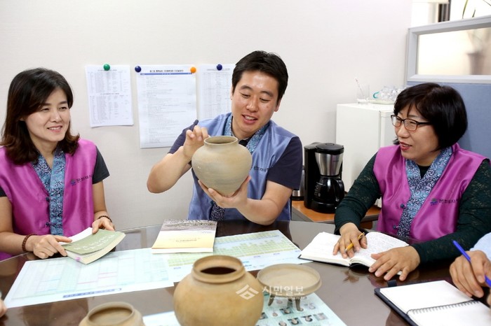 최근 송파구가 한성백제의 전통을 지키기위해 매주 수요일마다 백제 전통양식 근무복 입기를 실시했다. 사진은 백제 전통양식 근무복을 입고 업무를 보는 문화재관리팀과 풍납토성관리팀의 모습. (사진제공=송파구청)