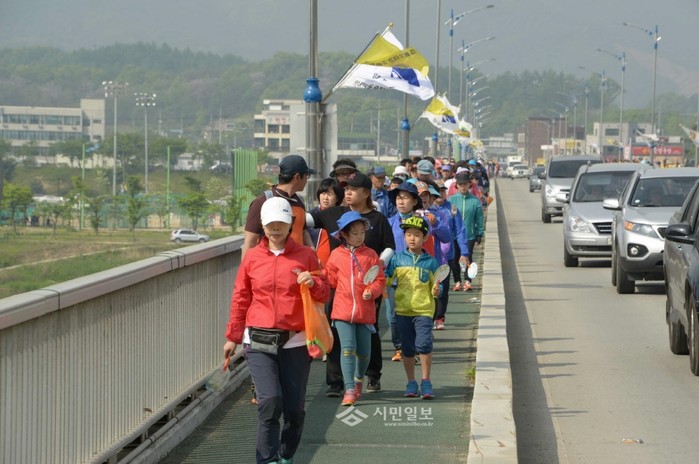 경기 양평군이 최근 양평나루께축제공원에서 개최한 '제10회 가족건강 걷기대회'에 참여한 주민들이 물소리길을 따라 걷고 있다.(사진제공=양평군청)