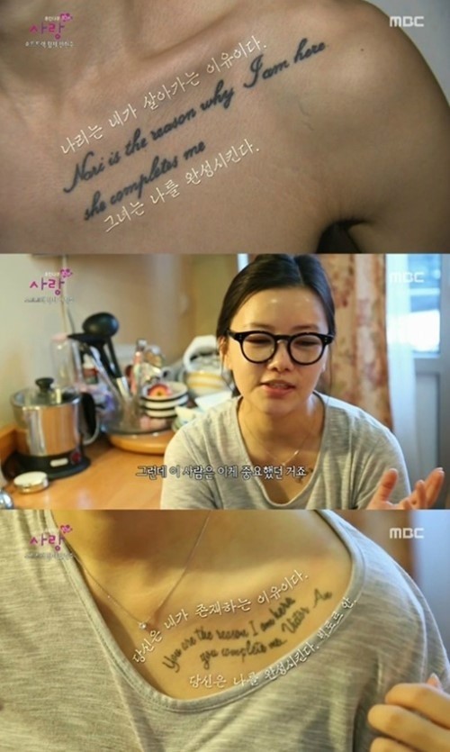 안현수 선수는 문신에 대해 "'나리는 내가 살아가는 이유다. 그녀는 날 완성시킨다'라고 새긴 문신이다"라고 밝혔다.