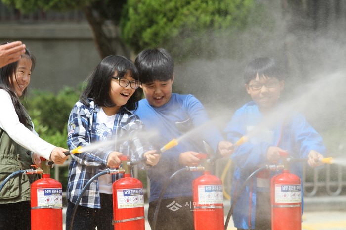서울 관악소방서가 최근 난향초등학교에서 학생 및 교사들을 대상으로 소방관체험행사를 실시해 행사에 참여한 어린이들이 직접 물소화기 사용 체험을 하고 있다.(사진제공=관악소방서)