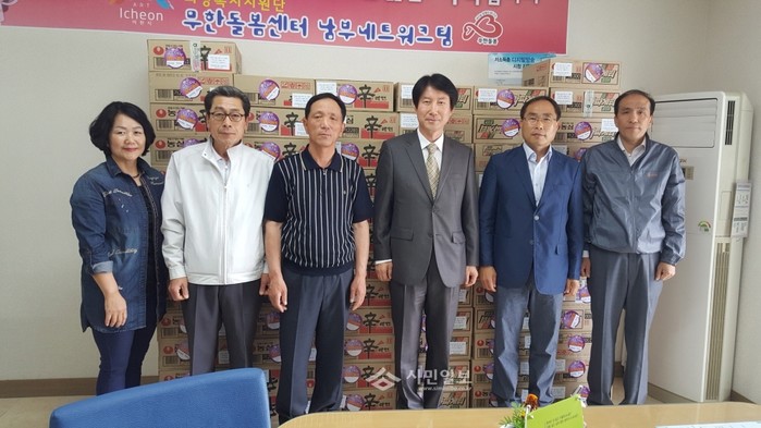 장호원감리교회가 최근 5월 가정의 달을 맞아 경기 이천시 무한돌봄남부네트워크팀을 방문해 지역내 소외계층을 위해 라면 84박스를 기탁하고 관계자들과 기념촬영하고 있다.(사진제공=이천시청)