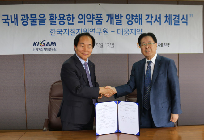 ㈜대웅제약(대표 이종욱)은 지난13일 강남구 삼성동에 위치한 대웅제약 본사에서 한국지질자원연구원(원장 김규한)과 광물자원을 활용한 의약품 개발 협력을 위한 양해각서(MOU)를 체결했다고 14일 밝혔다.
