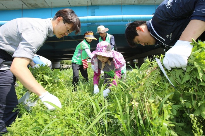 지난 13일 서울 송파구 성내천에서 자연형 하천복원을 위해 실시한 '성내천 생태교란 식물제거'에 참가한 자원봉사자 50여명이 환삼덩굴 등의 생태교란 식물제거 작업을 하고 있다. (사진제공=송파구청)
