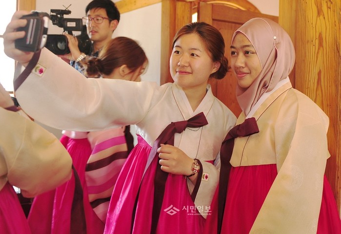 서울 광진구 능동로 건국대학교 도정궁 경원당에서 최근 열린 '우리는 하나 전통 愛-성년식'에 참가한 외국인 유학생들이 한복을 입은 본인들의 사진을 촬영하고 있다. /뉴시스