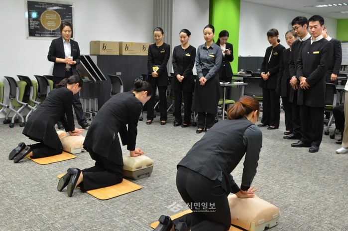 영등포소방서가 최근 콘레드 서울호텔에서 직원 50여명을 대상으로 화재 발생시 행동요령과 심폐소생술 등에 관한 '소방안전교육'을 실시해 참여 직원들이 소방대원의 교육에 따라 심폐소생술을 배우고 있다. (사진제공=영등포소방서)