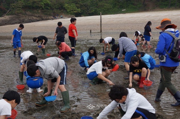 충남 아산 인주중학교는 최근 '1교1촌 자매결연 어촌생활 진로체험'을 실시해 참여 학생들이 직접 갯벌에서 동북, 바지락 등을 잡고 있다. (사진제공=아산교육지원청)