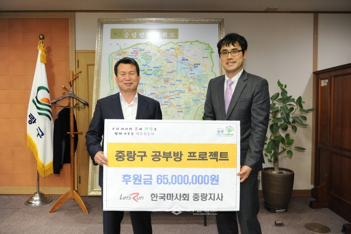 지난 13일 오후 한국마사회 중랑지사가 '중랑구 공부방 프로젝트' 사업 지원을 위해 6500만원을 기부하고 나진구 중랑구청장(왼쪽)과 기념 촬영을 하고 있다.(사진제공=중랑구청)