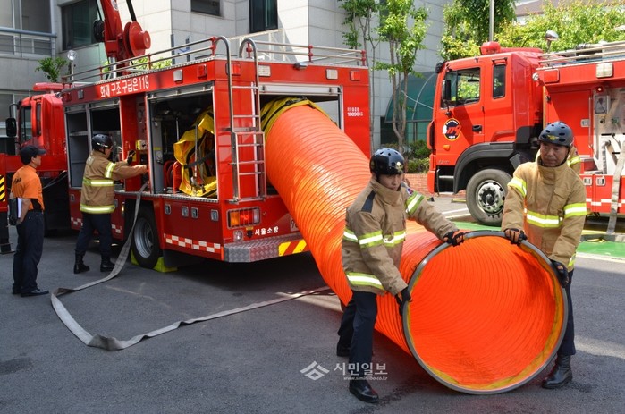 서울 서대문소방서 현장 출동대원들이 최근 특장소방차 4종(고다사다리차, 굴절차, 펌프차, 화학차)에 대한 집중훈련을 실시해 화학차를 이용한 훈련을 진행하고 있다.(사진제공=서대문소방서)