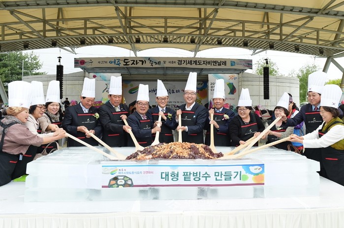 경기 여주시는 최근 '여주도자기축제' 주행사장에서 '제4회 향토요리 경연대회'를 실시해 원경희 여주시장(가운데)과 관계자들이 주걱으로 대형 팥빙수를 만들며 기념촬영하고 있다.(사진제공=여주시청)