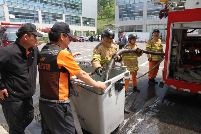 서울 은평소방서가 최근 본서 후정에서 '2015년 특장소방차 운용능력 경연평가'를 실시해 참여 소방대원들이 소방특장차 운용 능력 경연을 진행 중인 모습. (사진제공=은평소방서)