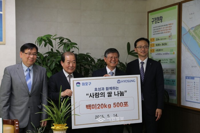 박홍섭 서울 마포구청장(왼쪽에서 두번째)이 가정의 달을 맞아 14일 마포구청에서 진행된 '효성과 함께하는 사랑의 쌀 500포 및 전달식'에 참석해 효성 관계자와 기념촬영을 하고 있다.