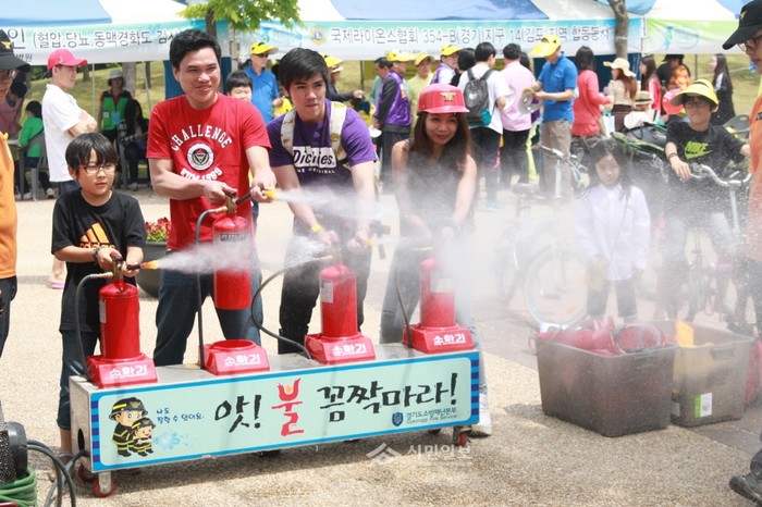 경기 김포소방서가 최근 걸포중앙공원에서 '2015 김포세계인큰잔치 행사' 소방체험장을 운영해 외국인들이 물소화기 체험에 참여하고 있다.(사진제공=김포소방서)