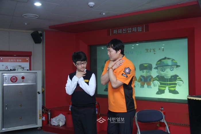서울 동작소방서가 최근 본서 3층 소방안전체험교실에서 영등포중학교 학생들을 대상으로 소방관 직업체험교실을 실시해 한 학생과 소방대원이 체험교육을 실시하고 있다. (사진제공=동작소방서)