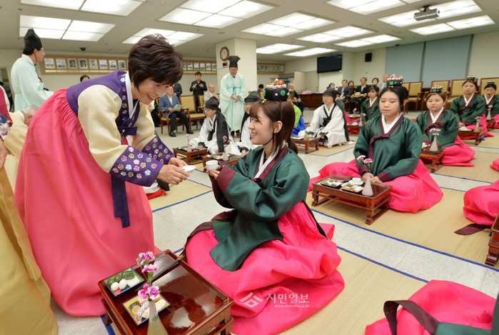 서울 동대문구청에서 최근 '제6회 동대문구 전통 성년례의식'이 열려 참가자들이 성년이 됐음을 의미하는 술을 마시고 있다. (사진제공=동대문구청)