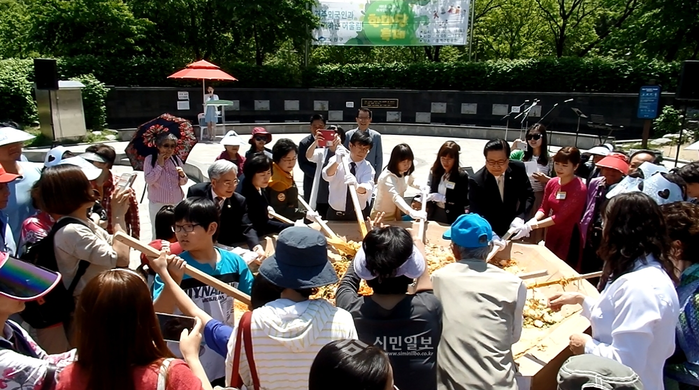 서울 노원구가 최근 중계근린공원에서 '세계인의 날'을 기념해 '거주외국인과 함께하는 어울림 한마당 축제'를 개최했다. 사진은 김성환 노원구청장(가운데)이 거주외국인, 주민들과 함께 300인분 대형 비빔밥 퍼포먼스를 하고 있는 모습. (사진제공=노원구청)