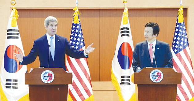 한국을 방문한 존 케리 미국 국무장관과 윤병세 외교부 장관이 18일 서울 종로구 외교부 국제회의장에서 한미 외교장관 공동기자회견을 하고 있다.