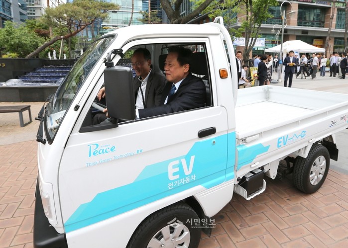 서울 금천구가 지난 18일 '금천구 기업지원센터'에서 전기차보급 활성화를 위한 시승식을 개최해 차성수 구청장(오른쪽)이 직접 전기차를 시운전하고 있다.(사진제공=금천구청)