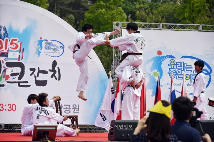 경기 김포시가 최근 개최한 '2015 김포세계인 큰잔치' 행사에서 외국인주민지원센터 외국인근로자 태권도반 수강생들이 태권도 공연을 펼치고 있다.(사진제공=김포시청)