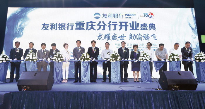 | ▲ 지난 19일 저녁 중국우리은행 충칭분행 개점식에서 이광구 은행장(사진 왼쪽 7번째)이 현지 유관기관 및 진출기업 관계자들과 함께 테이프 커팅을 하고 있다. | ||