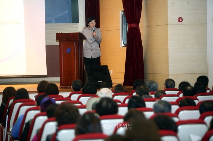 지난 19일 서울 강남구 대치2문화센터에서 열린 ‘학교보안관 교육’에 참석한 신연희 구청장이 학교보안관 자원봉사자 220명을 대상으로 교육을 실시하고 있다. (사진제공=강남구청)