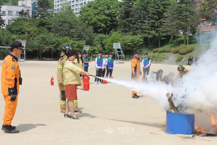 경기 이천교육지원청이 20일 이천소방서와 연계해 이천고등학교 학생들과 교직원들을 대상으로 화재 발생시 위기대응 능력을 점검하는 '공공기관 합동 소방훈련'을 실시해 한 교사가 소화기를 이용해 불을 끄고 있다.(사진제공=이천교육지원청)
