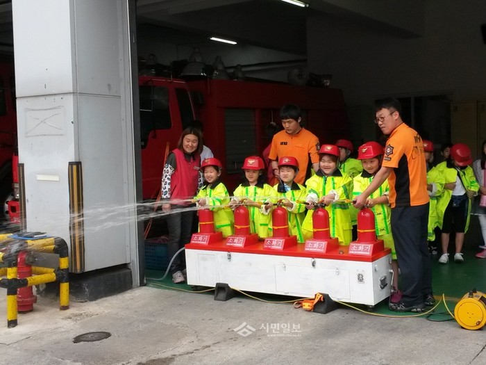 오산시 초등생들 소방서탐방학교서 물소화기 체험