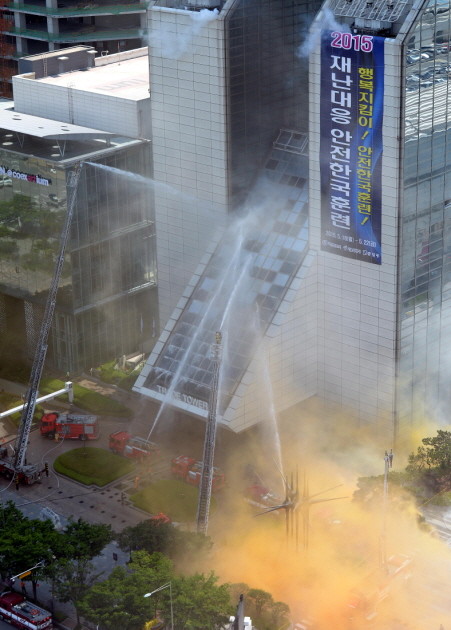 20일 오후 서울 강남구 삼성동 트레이드타워에 열린 서울시 민.관 합동 초고층건물 화재 대피훈련에서 소방관들이 화재를 진압하고 있다.