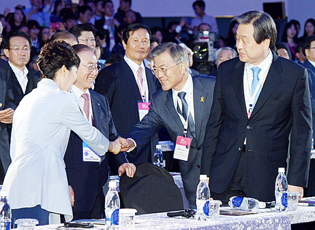박근혜 대통령이 20일 오전 서울 중구 동대문 디자인 플라자(DDP)에서 열린 서울디지털포럼 2015 개막식에 참석하며 새정치민주연합 문재인 대표와 인사를 나누고 있다.