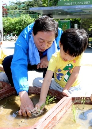 금천구가 지난 20일 오전 금천구청 2층 옥상텃밭에서 '어린이 모내기 체험 행사'를 진행해 꿈나래어린이집 원생들과 차성수 구청장이 모내기 체험을 하고 있다. (사진제공=금천구청)