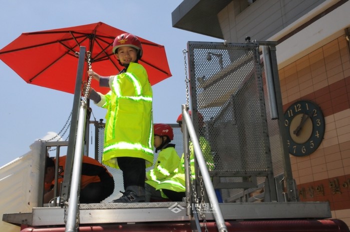 서대문소방서가 최근 이화여대부속초등학교에서 1학년 학생들을 대상으로 이동안전체험차량 체험 및 대피훈련을 실시해 참여 어린이가 경사하강식 구조대 체험을 하기 위해 대기하고 있다. (사진제공=서대문소방서)