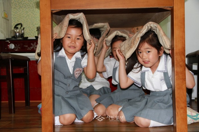 서울 구로소방서가 지난 20일 오전 동정성모유치원 원생들을 대상으로 본서 3층 소방안전체험교실에서 '병아리 소방관' 체험학습을 운영해 참여 어린이들이 지진대피 체험을 위해 식탁 밑으로 대피하고 있다. (사진제공=구로소방서)