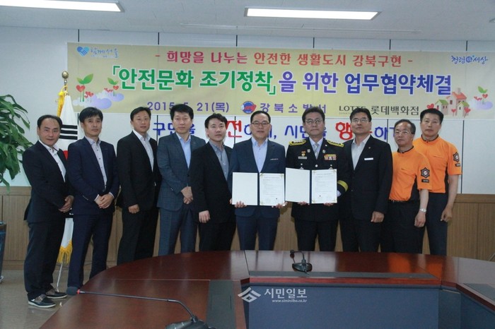 서울 강북소방서가 21일 본서 3층 소회의실에서 롯데백화점 미아점과 소방안전문화 정착을 위한 업무협약을 체결해 김학준 강북소방서장(오른쪽에서 네 번째)과 롯데백화점 관계자들이 협약식 후 기념촬영하고 있다.(사진제공=강북소방서)