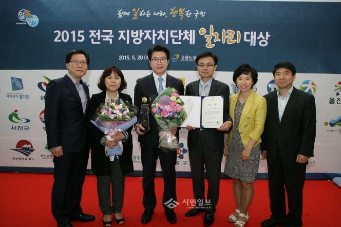 서울 성동구가 최근 고용노동부가 주최한 '2015년 전국지방자치단체 일자리대상'에서 최우수상을 받아 정원오 구청장(왼쪽에서 세 번째)이 시상식에서 구청 관계자들과 기념촬영하고 있다.(사진제공=성동구청)