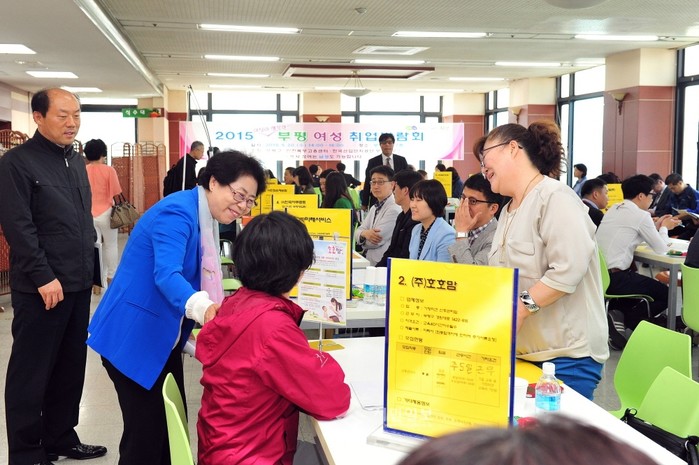 인천 부평구가 지난 20일 구청 7층 대회의실에서 '2015 여성취업UP박람회'를 개최해 홍미영 부평구청장(왼쪽)이 행사장을 찾은 여성 구직자에게 격려 인사를 전하고 있다.(사진제공=부평구청)