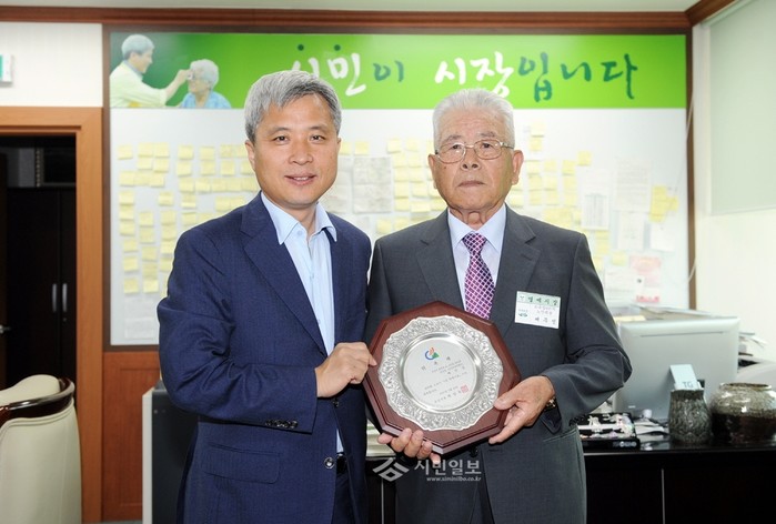 경기 오산시가 최근 민선6기 제9대 '1일 명예시장' 위촉식을 진행해 곽상욱 오산시장(왼쪽)이 전 운암주공4단지 아파트 통장과 노인회장을 지낸 배무성씨에게 명예시장 위촉장을 전달하고 있다. (사진제공=오산시청)