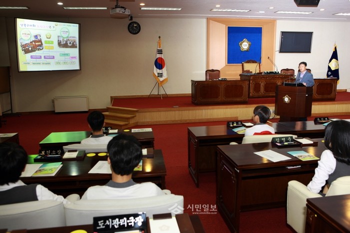 최근 서울 강북구의회에 수송중학교 송기종 교사와 학생회 임원진 2~3학년 학생 18명이 체험활동을 위해 방문했다. 사진은 의회를 방문한 학생들이 본회의장에 앉아 구의회 홍보영상을 시청하는 모습. (사진제공=강북구의회)