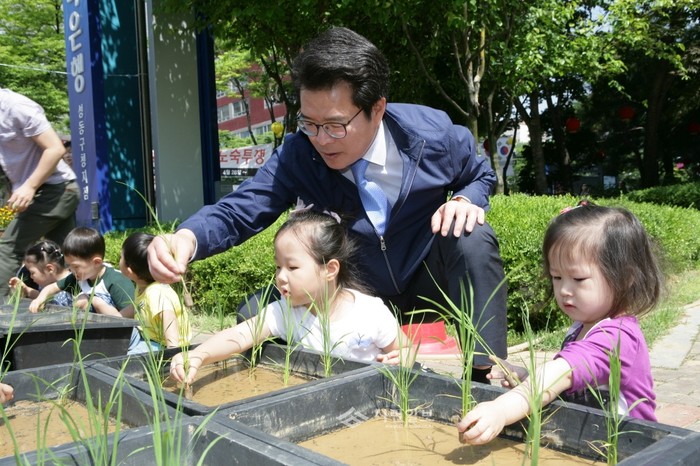 최근 성동구청 앞 광장에서 열린 주민과 함께 하는 모내기 행사에 참여한 어린이들이 정원오 성동구청장과 함께 도심에서 경험하는 모 심기 체험을 하고 있다.(사진제공=성동구청)