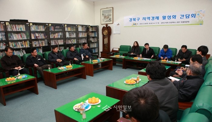 | ▲ 강북구의회 민원처리 관련 특별위원회가 강북구 지역경제 활성화 간담회를 주최해 관계자들이 이야기를 나누고 있다.(사진제공=강북구의회) | ||